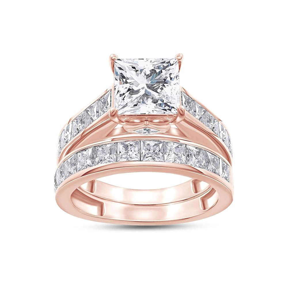 Metal: This Princess Cut Bridal Set is crafted in high-quality 10k Solid Rose Gold and is authenticated with a 10k stamp. It offers exceptional shine and protection allowing the Lab Created Moissanite gemstone to truly sparkle. This Lab Created Moissanite bridal set provides an enchanting and effortless look she'll adore.