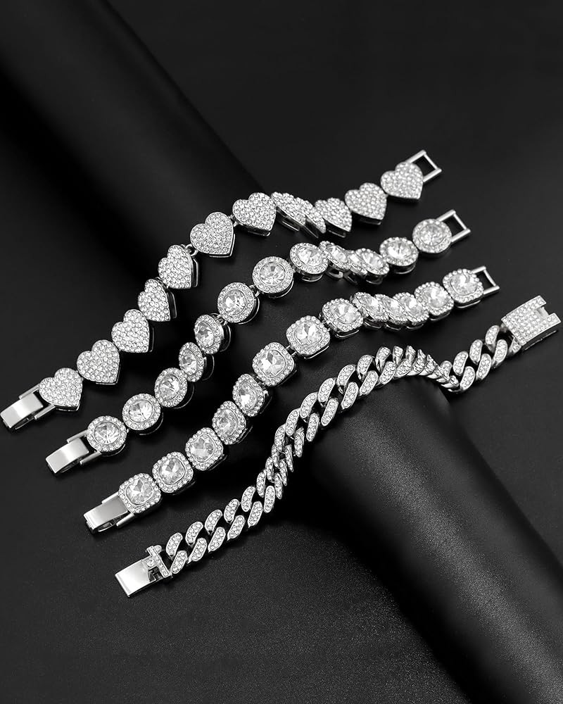 • 4PCS: This women bracelet set includes four different styles of bracelets: a heart bracelet, a square tennis chain, a round tennis chain, and a Cuban chain bracelet. Each bracelet measures 8 inches long. Wear crystal bracelet alone or layer it with other chains for a layered look.