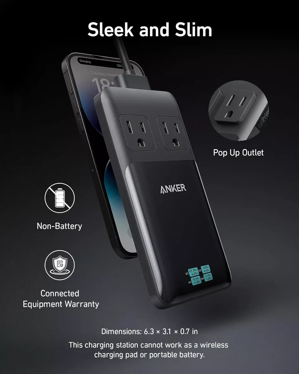 Ultra-Sleek and Portable: Designed with Anker's innovative stacked design with a pop-up outlet, this power strip is incredibly slim at just 0.7 inches thick, making it easy to carry in your bag or backpack.