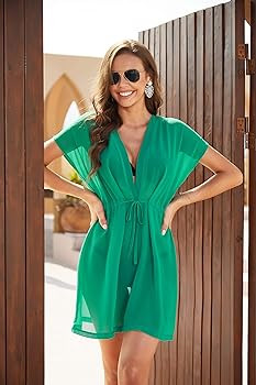 This bikini coverup comes with a deep V neck, chiffon short sleeve, long enough to cover bottom. It provides a good amount of coverage, is the most ideal item for wearing at beach and swimming pool