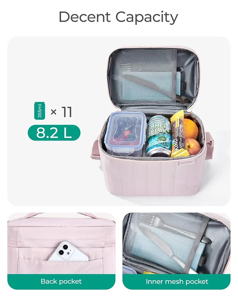 Ample Storage: Pack all your favorites with ease! Measuring 10" L x 6.7" W x 7.5" H, with a capacity of 8L, this lunchbox bag can hold up to 11 cans of cola or your complete lunch spread, including sandwiches, salads, drinks, and fruits. Perfectly designed for those on the move, it ensures you have everything you need for a wonderful day out, whether at work, picnics, or travel.