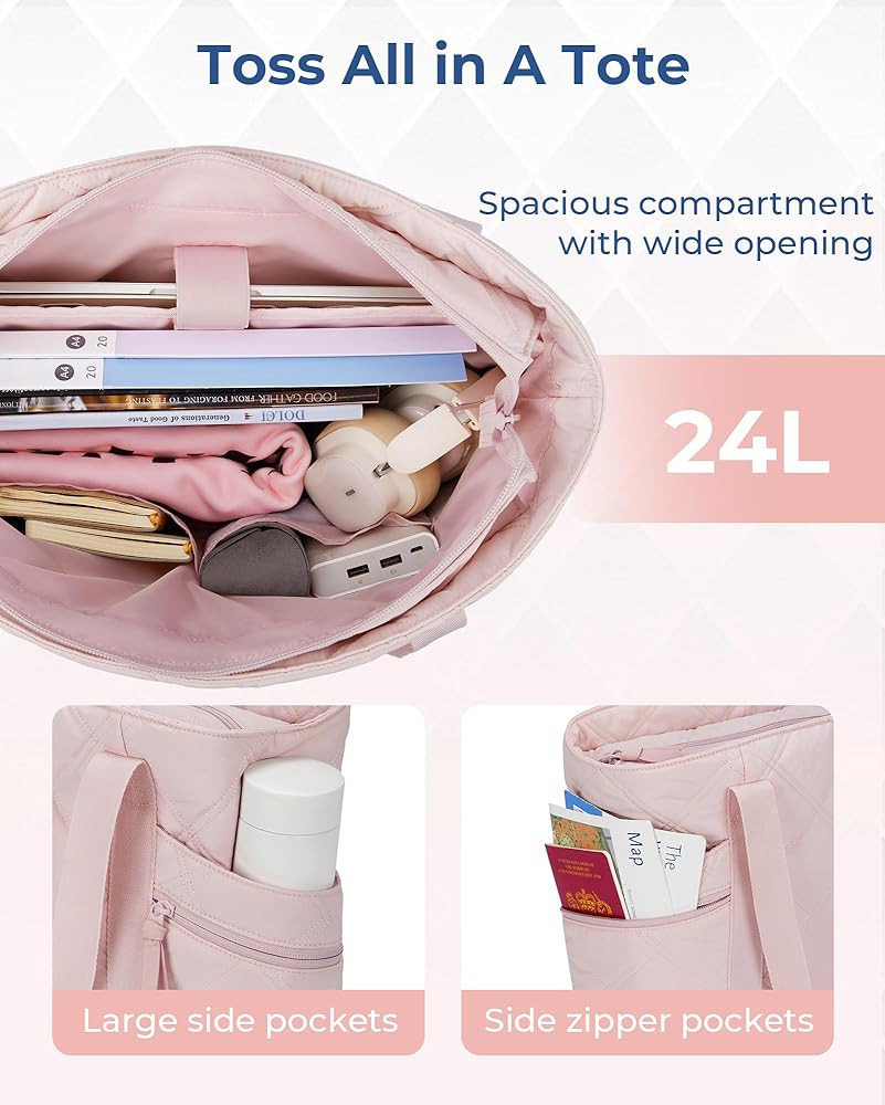 Capacity: 15.6*6.3*12.6 inches, 24L large capacity for all your items. Ultra lightweight yet substantial, ideal for carrying daily supplies. The stylish quilted and puffy tote design can match any outfit. Zipper closure prevents your stuff from getting lost