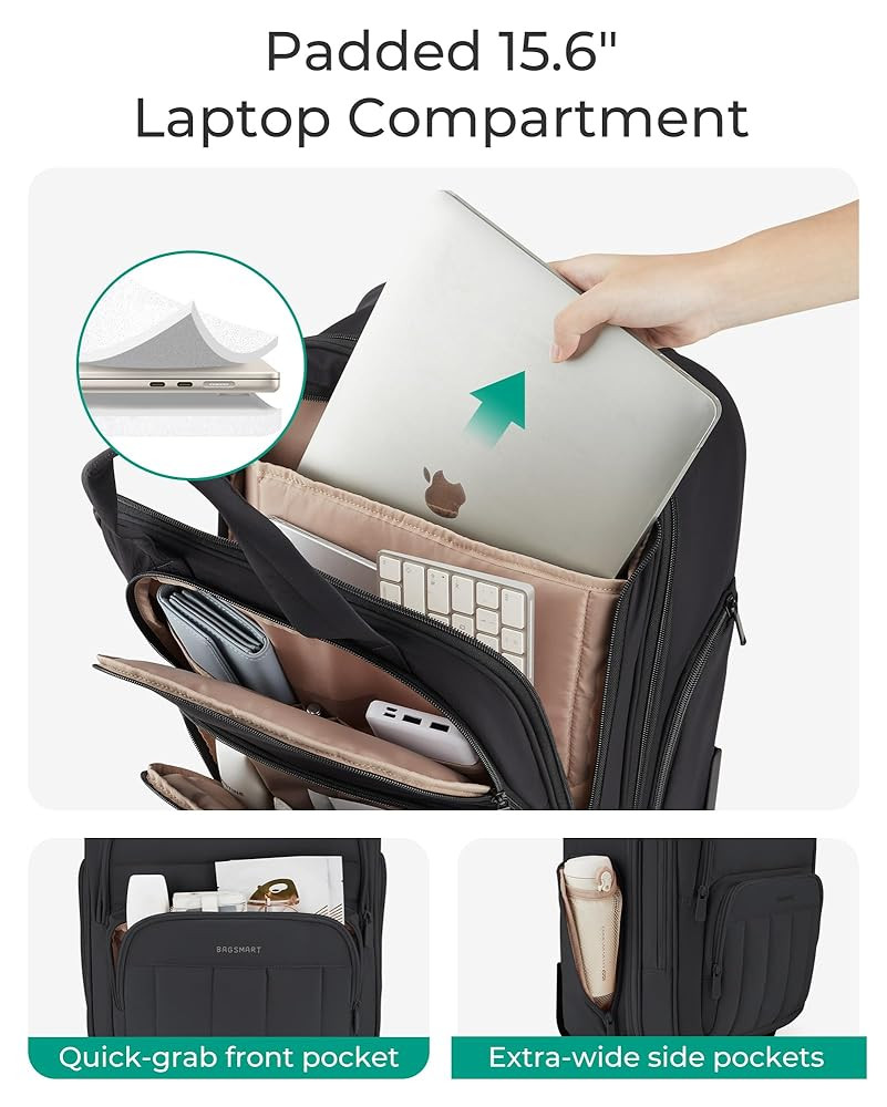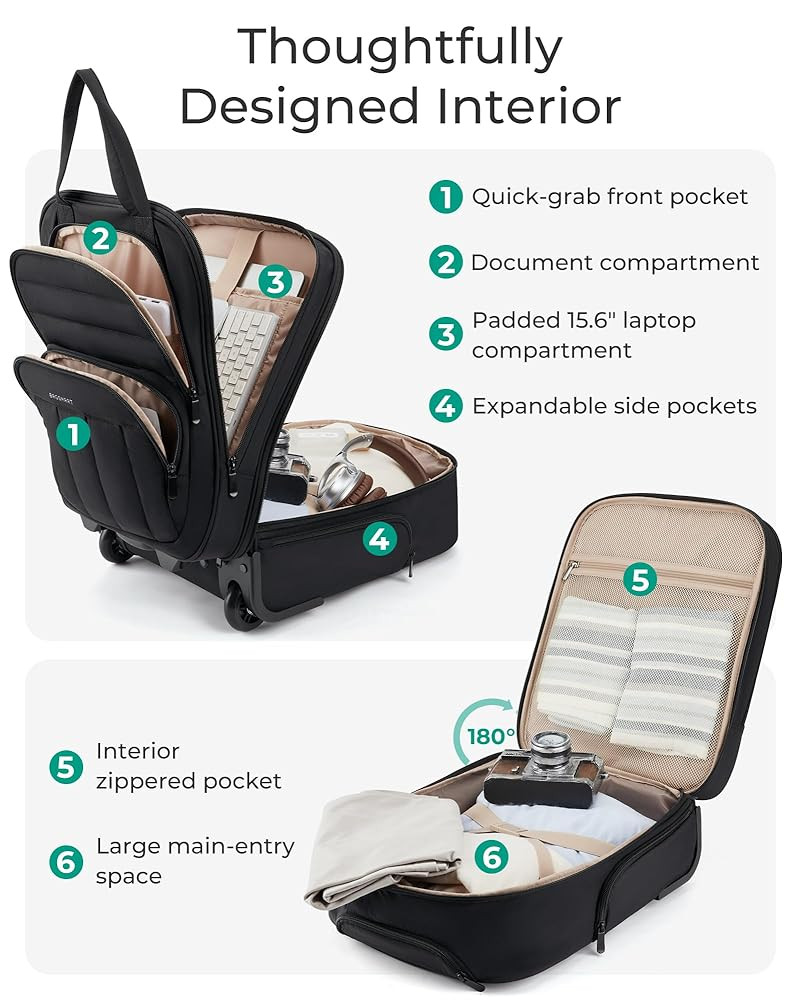 • Organized Storage: Effortless organization is achieved with ample storage, internal compartments, and a small zippered pocket for smaller items. The padded laptop compartment fits up to a 15.6-inch laptop. Making it an ideal carry-on for 2-3 day overnight trips.