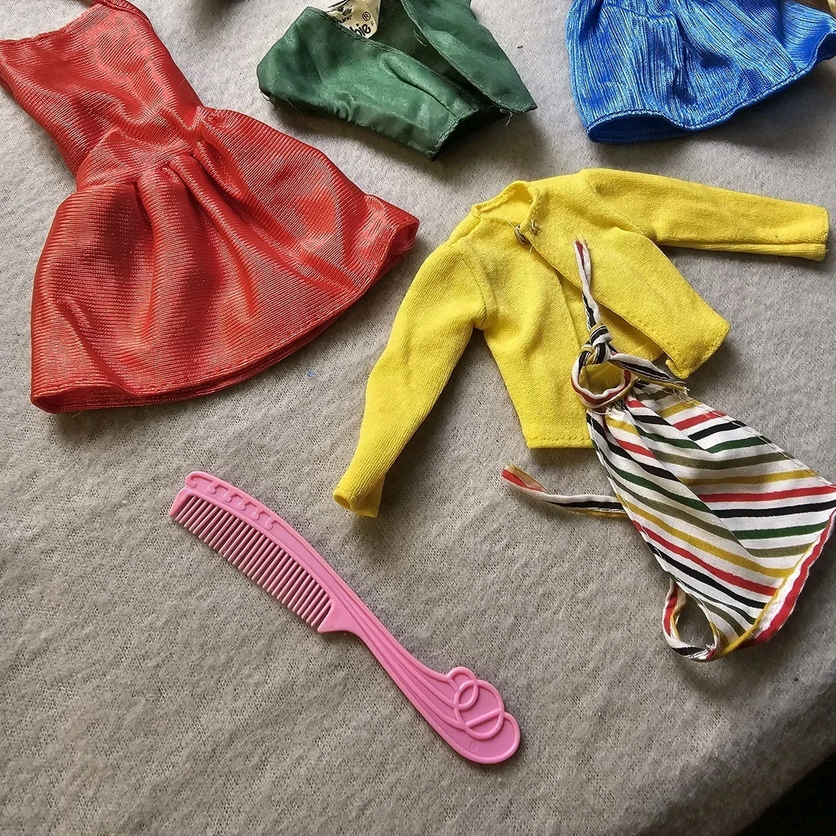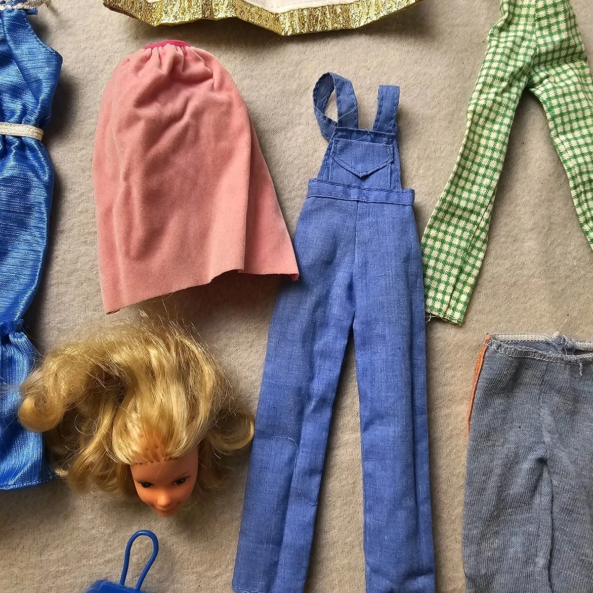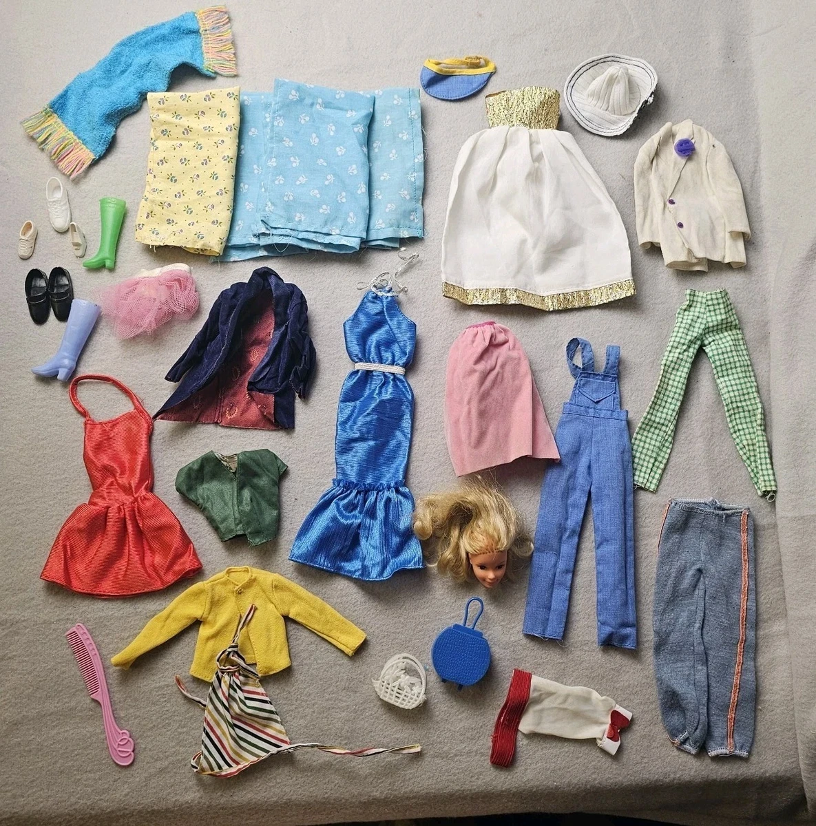 1st 2 pics show everything you will receive, other pics are close ups of everything, barbie head is dated 1976, and the neck ball thing is inside head, some clothing will need stain treatment, mainly the white jacket and some may need small sewing repairs.