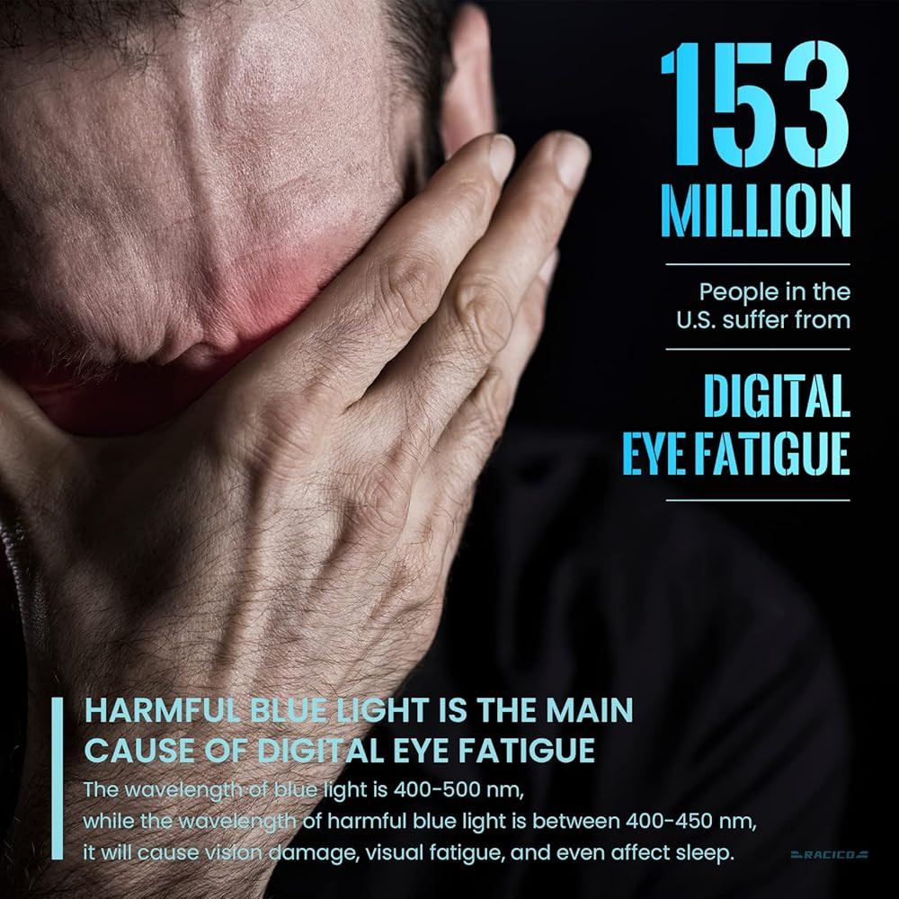 Blue Light Glasses; Anti Bluelight Glasses Lenses: Racico blue light blocking lenses Elevate your screen time comfort with these stylish men's eyewear frame blue light blocking glasses, designed to reduce eye strain and protect against harmful UV rays. Stay focused and comfortable with these anti-glare computer glasses featuring a women's eyewear frame, perfect for long hours in front of digital screens.