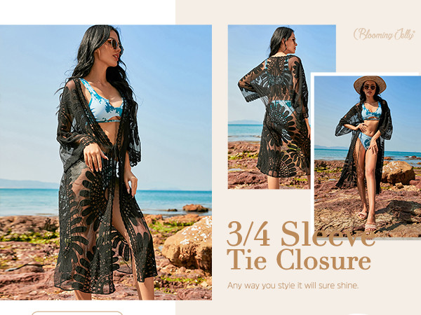 LACE FLORAL DESIGN - Featuring a stunning lace floral print, bathing suit cover up for women includes loose 3/4-length sleeves, a tie closure at the waist, and intricate lace trim detailing. The draped open front silhouette cascades into a straight mid-calf length hemline.