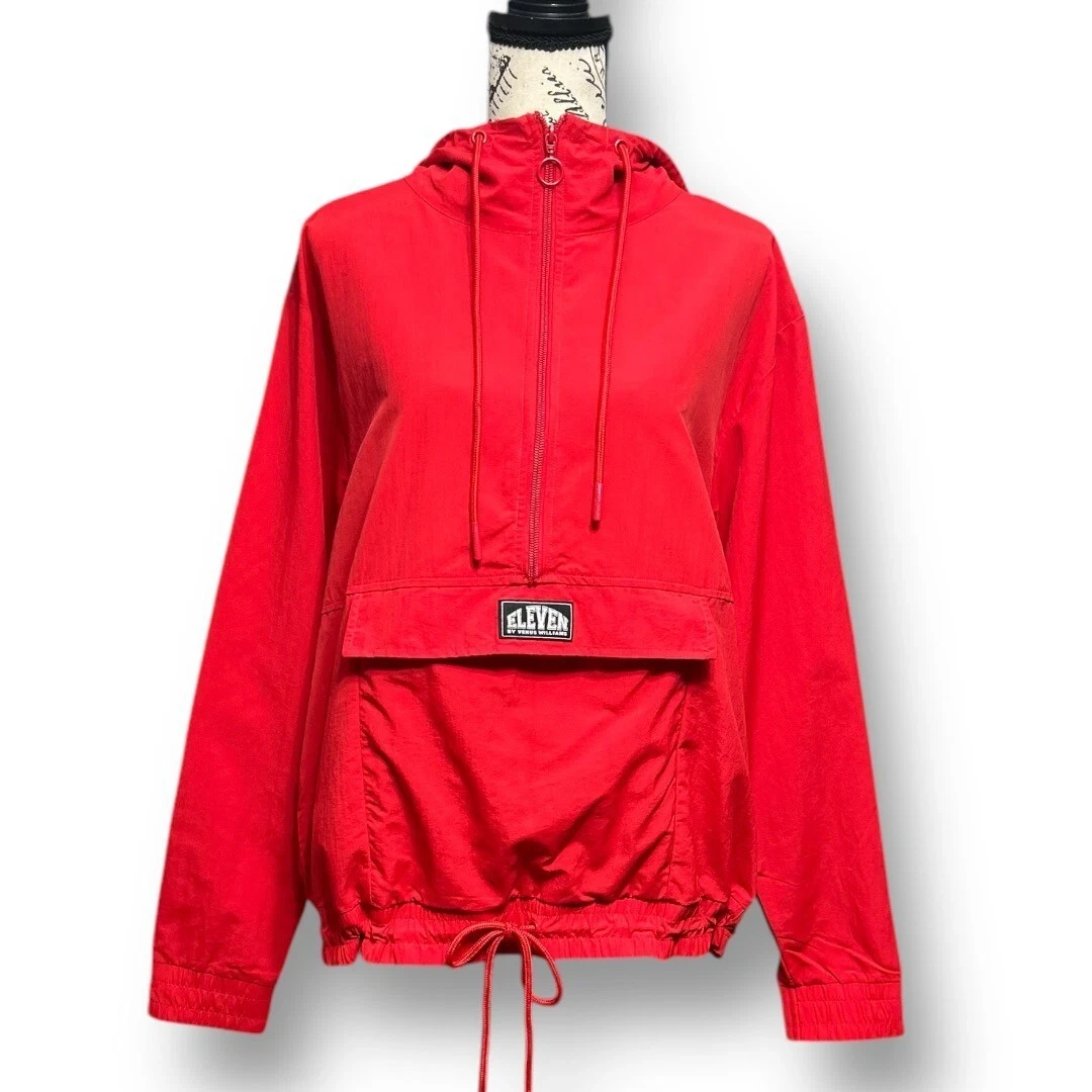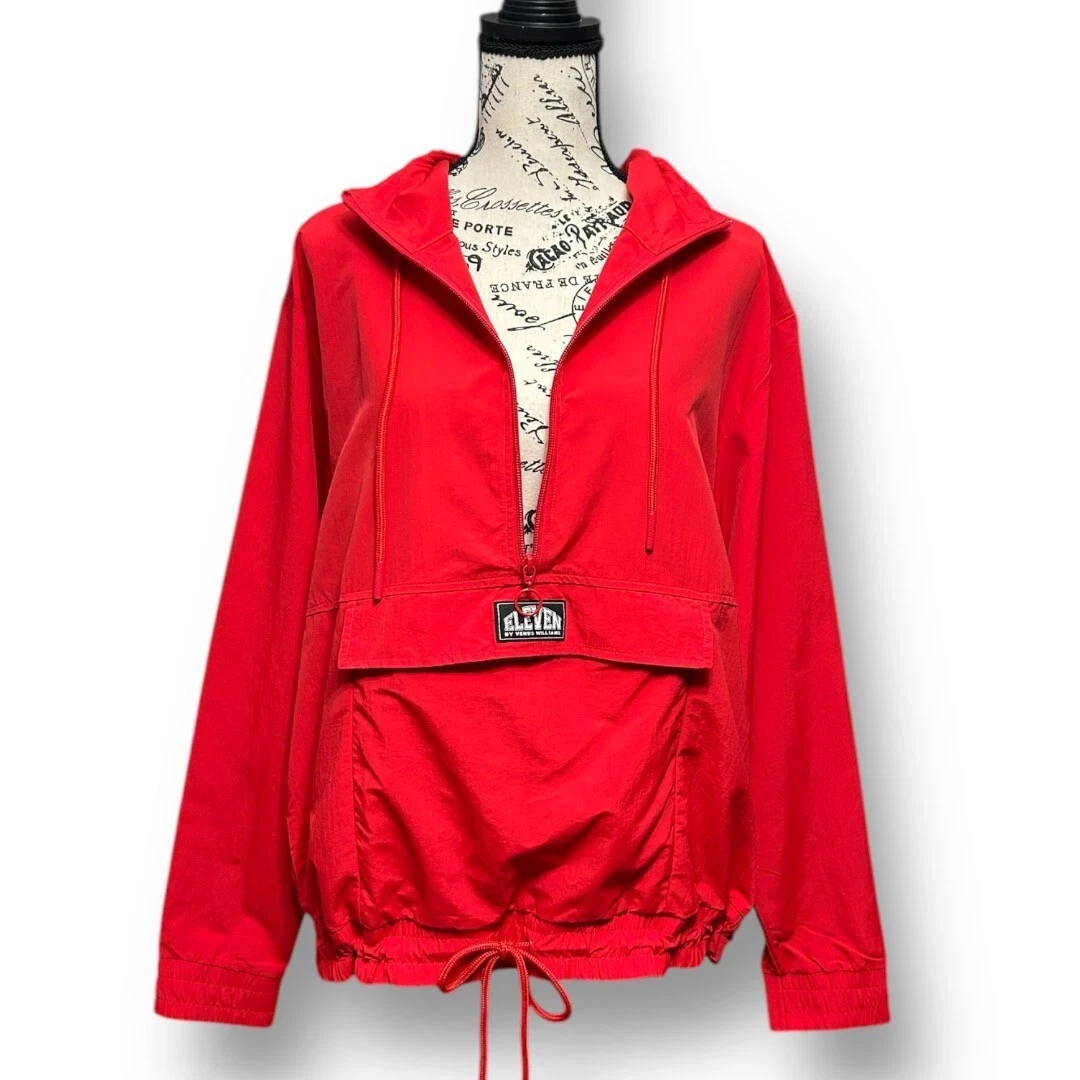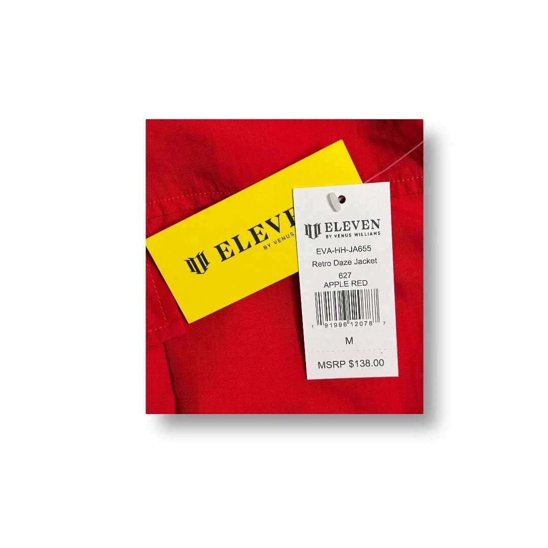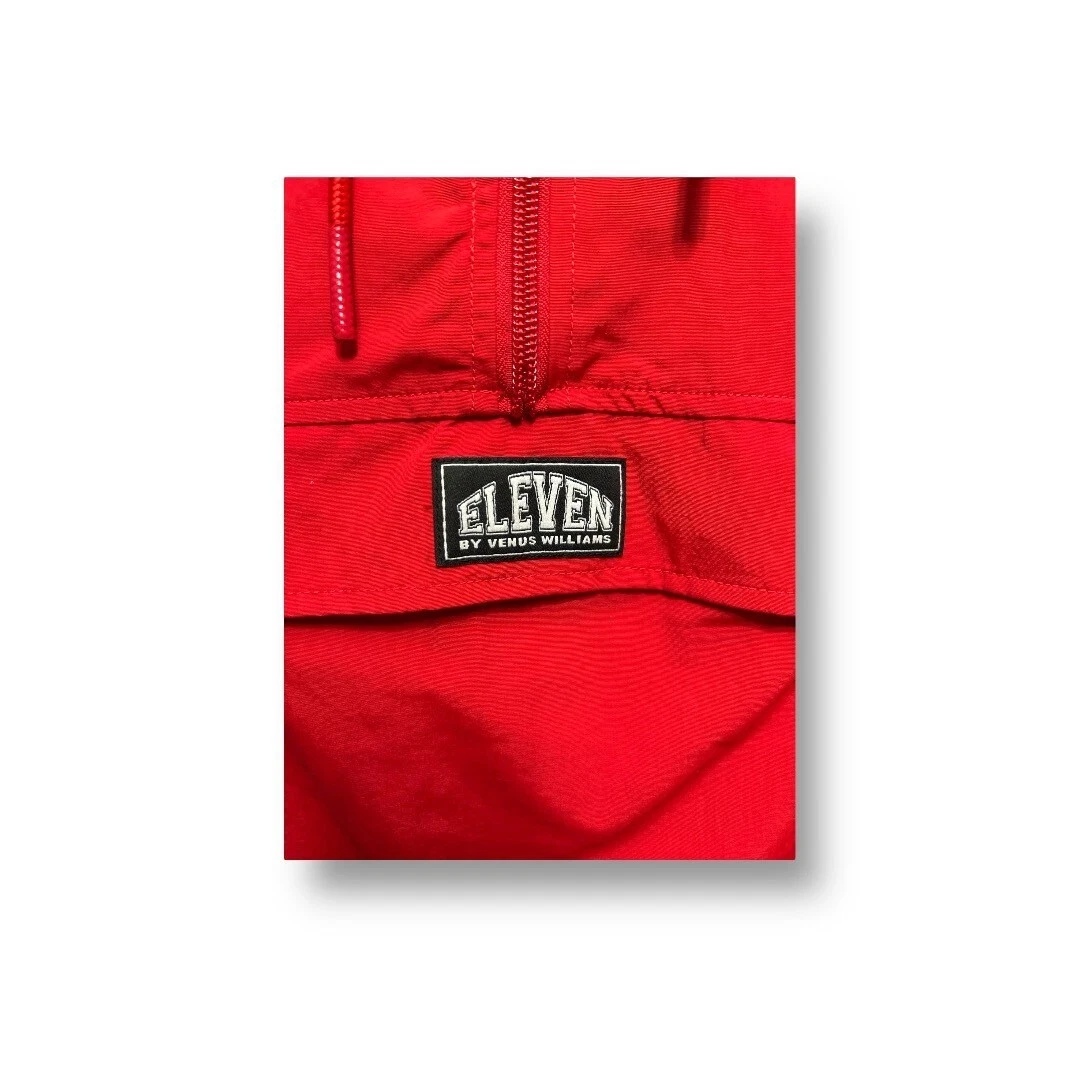 Description: Bold and sporty, this EleVen by Venus Williams Retro Daze jacket in apple red is perfect for warming up or cooling down. A lightweight tennis layer with a hood and front pouch. MSRP: $138.00