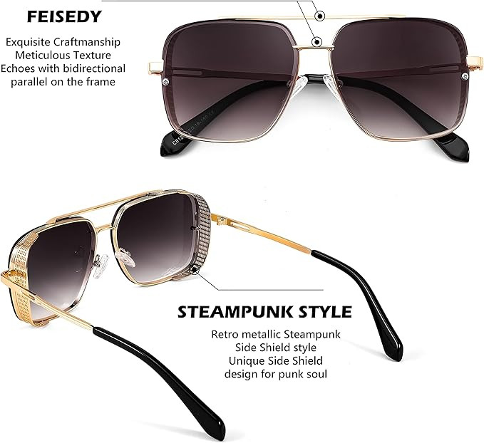 • FEISEDY Square Steampunk Sunglasses Design: inspired by vintage 80s oversized pilot sunglasses, combining with the fashion glasses for Square trend and retro metallic Steampunk Side Shield style, All the details are its interpretation of Retro Fashion.