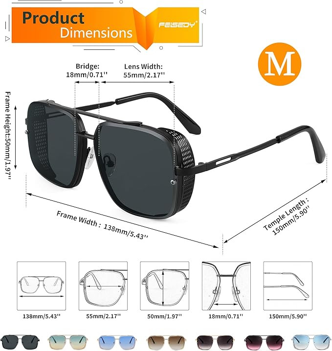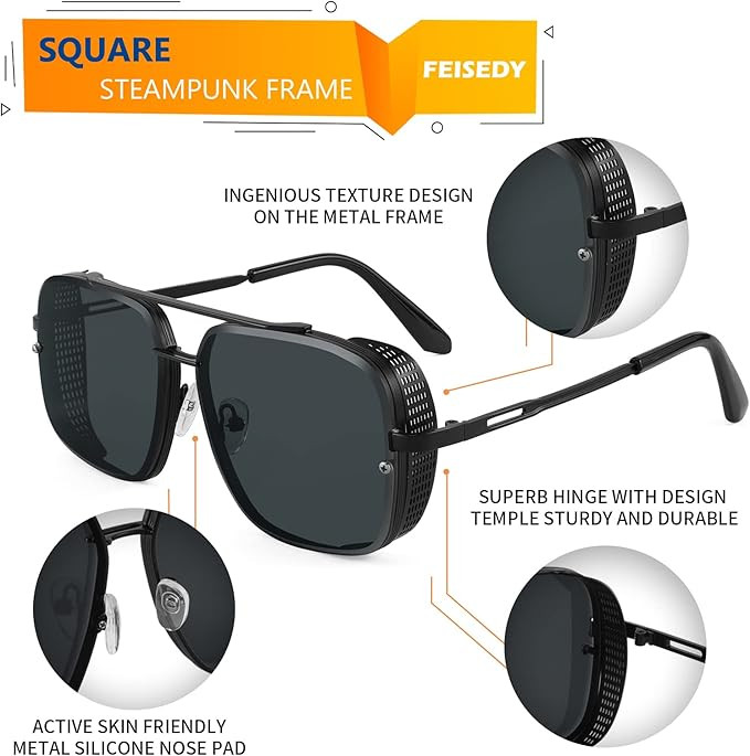 • FEISEDY Square Steampunk Sunglasses Design: inspired by vintage 80s oversized pilot sunglasses, combining with the fashion glasses for Square trend and retro metallic Steampunk Side Shield style, All the details are its interpretation of Retro Fashion.