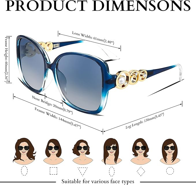 • [Large Frame for Standard] 61mm (2.40 inch) of lens width, 60mm (2.36 inch) of frame height, 144mm (5.67inch) of frame width, 20mm (0.79 inch) of nose bridge, and 138mm (5.43 inch) of leg length. Attention: Please confirm the size before purchase.