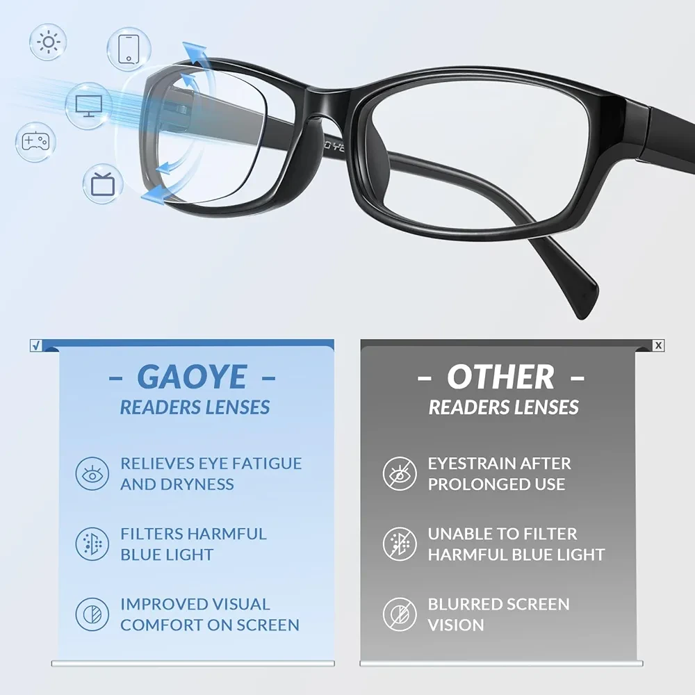 READING GLASSES - Anti bluelight glasses lenses: Gaoye reading glasses with ultra clear glasses lenses have UV400 protection and blue light blocking effect, easily filter 98.67% of harmful blue ray, relieves eye strain and migraines, creating a comfortable reading environment