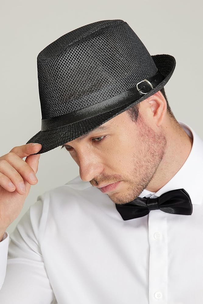 Design: Short brim and curled design. Decorated with black ribbon,Classic fedora hat style. This fedora hat suit for summer wear, because it can protect you from UV rays.