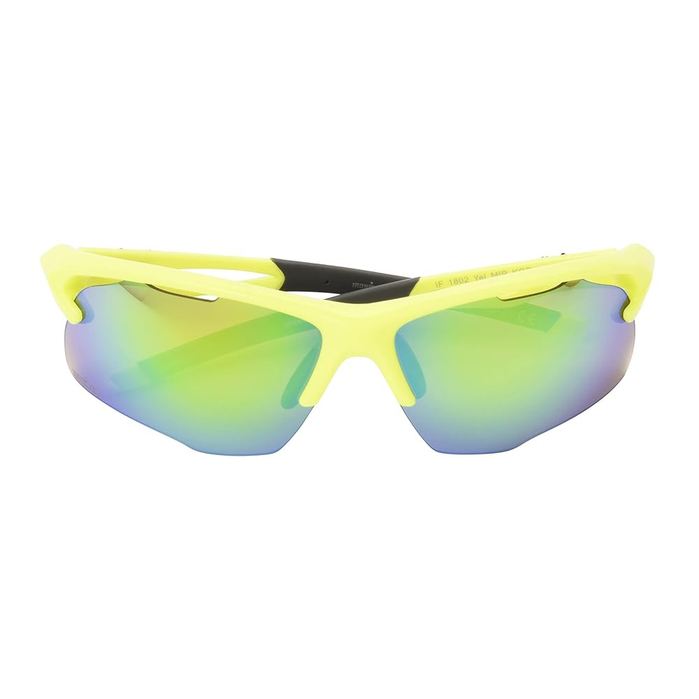 The 1802 Ironman sport shades for men provide 100% UVA/UVB eye protection in a blade-style frame made out of neon yellow plastic, so you can focus on the game, not the blinding sun. Dark grey rubber tips accent the arms of these rectangle sunglasses for men and, together with the grey rubber nose pads, help to hold the golf and baseball sunglasses securely in place, so they won't fall off when you're playing hard. For the ultimate in style and performance, the brown lenses with vibrant green mirror are also scratch- and impact-resistant with a hydrophobic coating that helps them to repel water. Ironman baseball and golf sunglasses for men are the ultimate triple-threat in durability, fit, and protection.