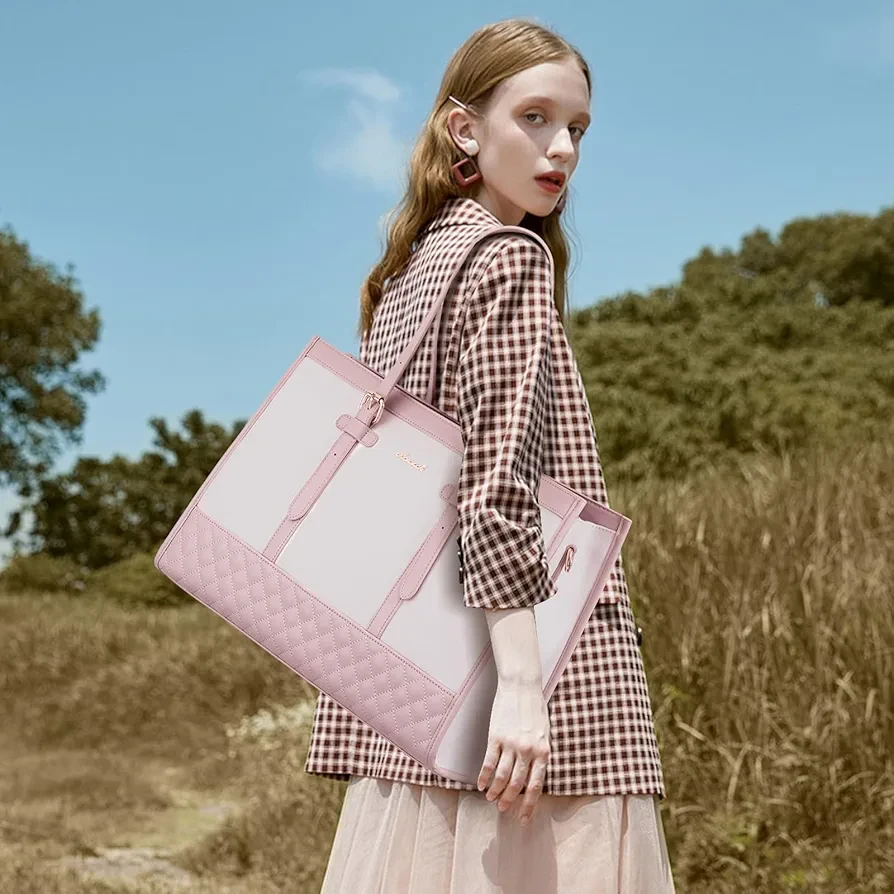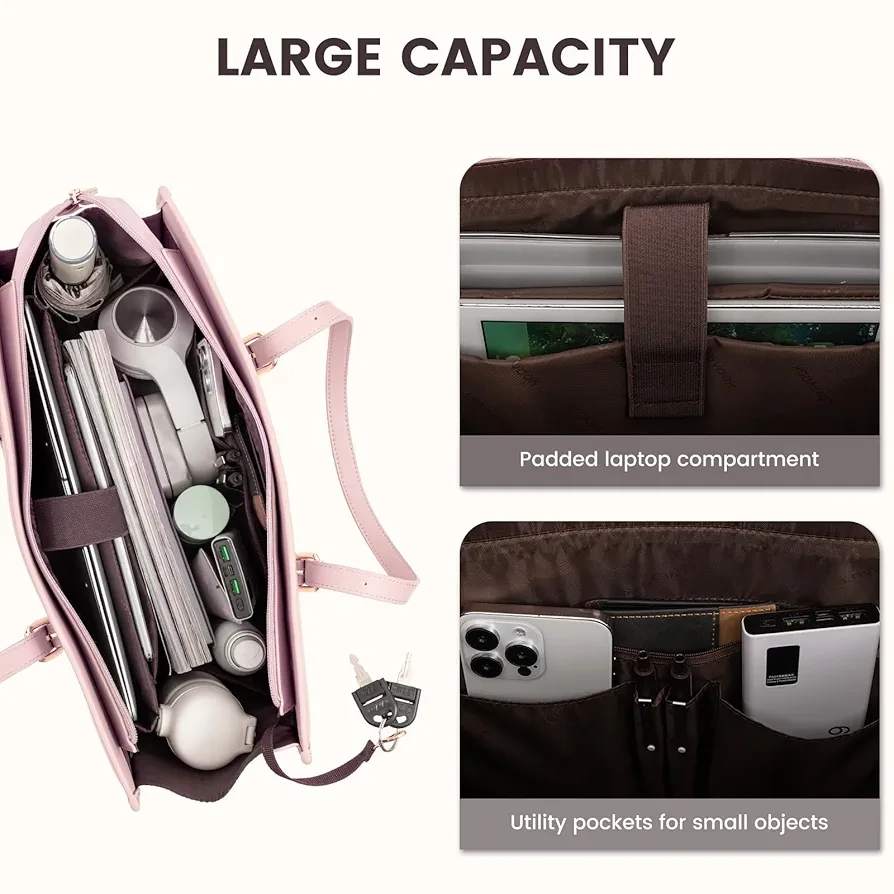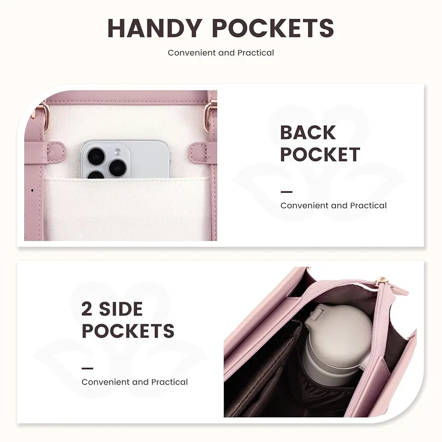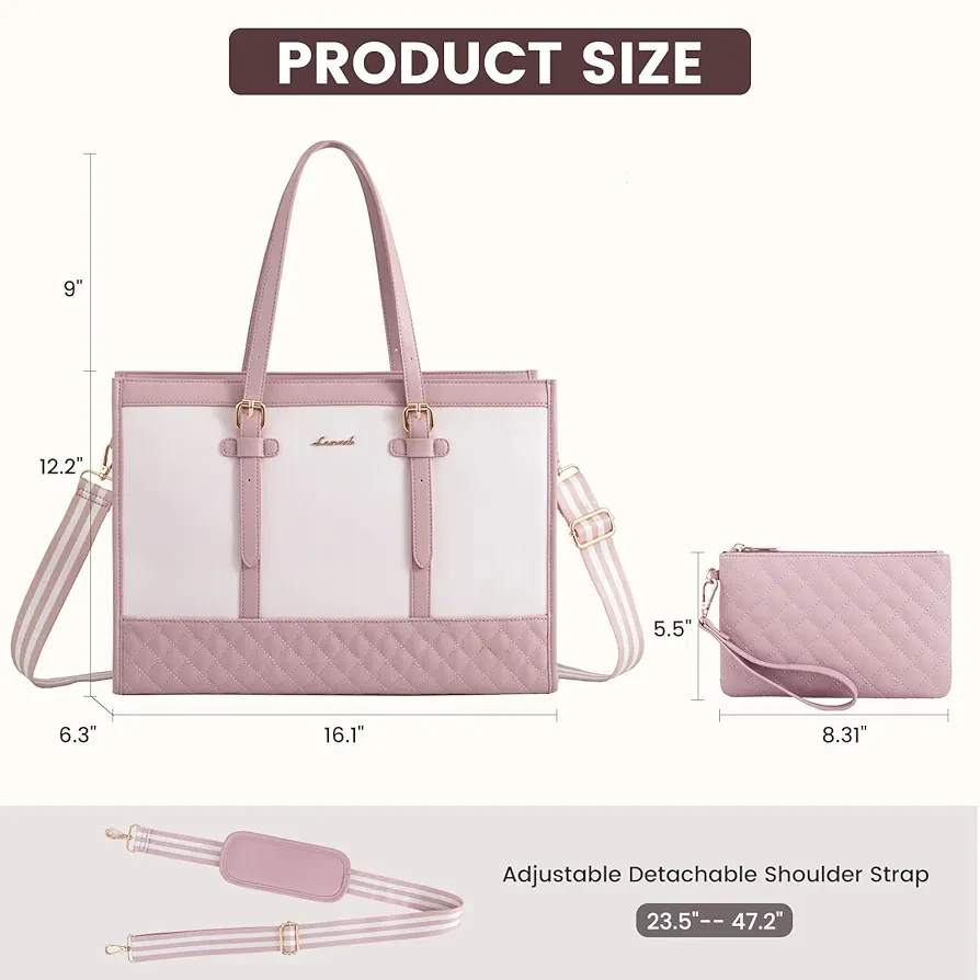 ? LARGE CAPACITY & LAPTOP COMPARTMENT ☛ Size of womens laptop bag: 16.1"*6.3"*12.2".The dedicated laptop compartment provides maximum protection for your device. 2 inner pockets,2 slip pockets, and 1 zipper pocket for small items such as a phone, wallet, makeup, passport, etc.