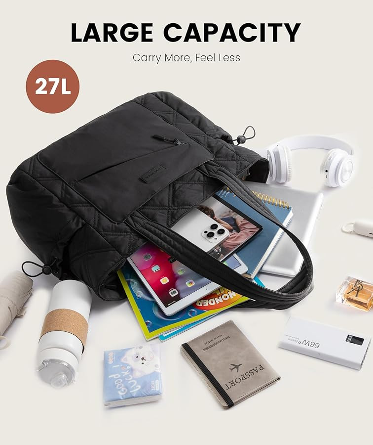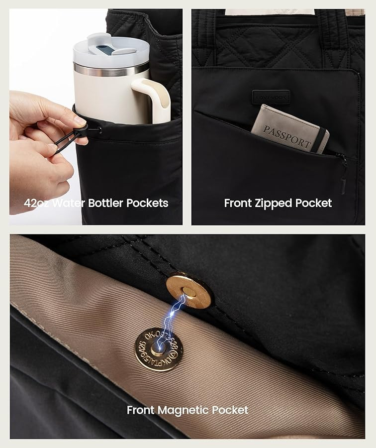 【Spacious Design with Smart Organization】 With dimensions of 16 x 12.8 x 6.2 inches, this tote offers large capacity without the bulk. Multiple internal and external pockets keep your laptop, water bottle, and other travel essentials neatly organized.