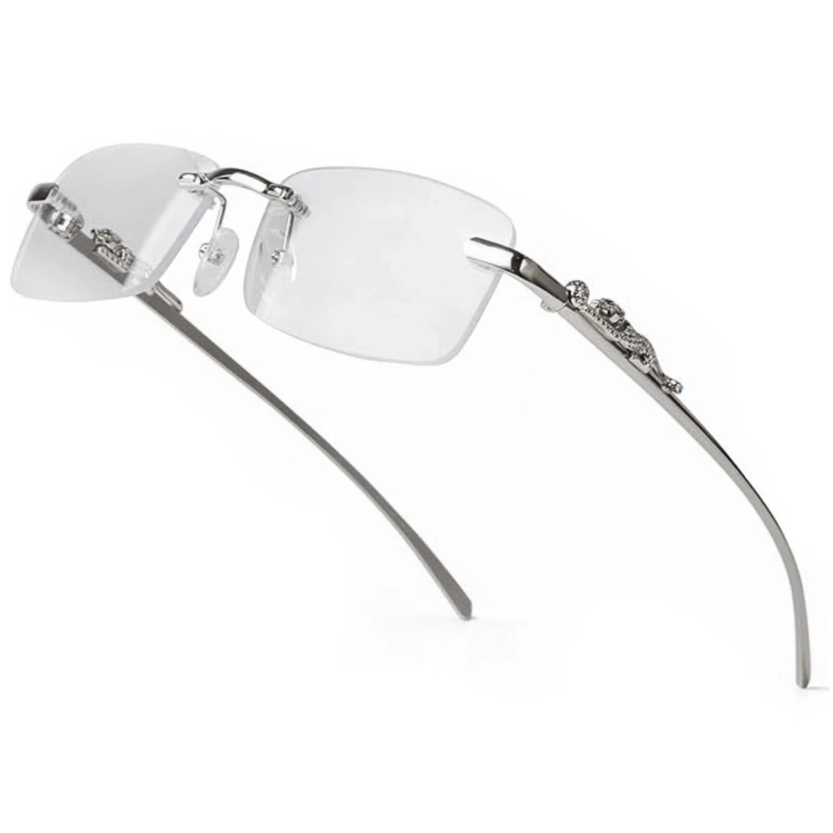 Unisex Trendy 90’s Hip Hop Retro Vintage Small Rimless Square Silver Wire Metal Frames Luxury Leopard Arms Frameless Glasses Rectangle Designer Narrow Clear Lens Eye Glasses For Men And Women.