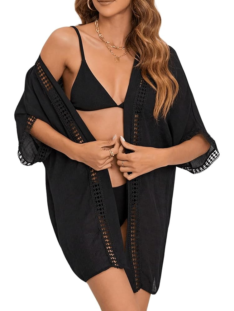 Feature: Hollow Out Trim, Open Front, Dolman Sleeve, Thigh Length, Plain, Kimono Cover Ups for Women
