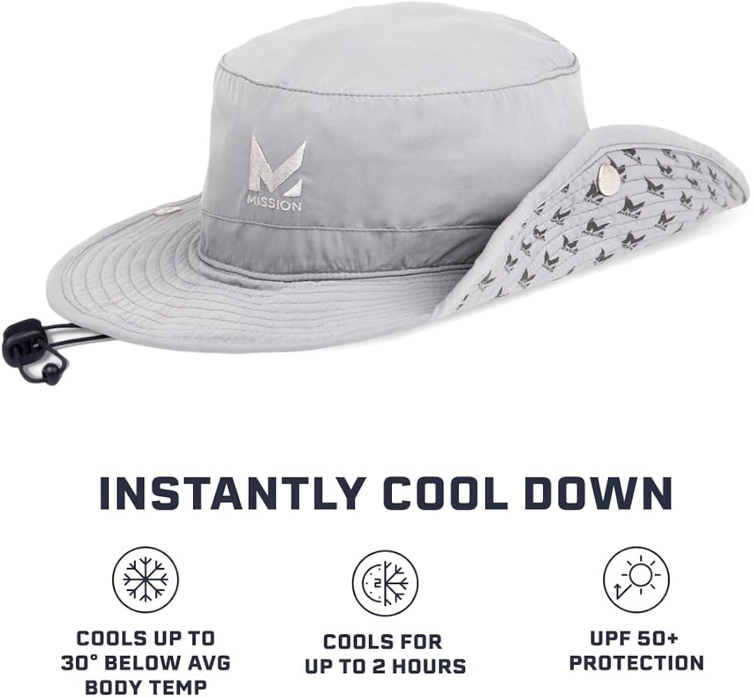 WATER & SWEAT ACTIVATED TECHNOLOGY: This cooling wide-brim hat incorporates advanced Wet-to-Cool Technology, which absorbs water or sweat to cool the hat by up to 30 degrees below average body temperature in under 1 minute. This innovative feature allows the hat to stay cool for up to 2 hours or longer with reactivation. By keeping cool, you can stay focused and dedicated to your activities without distraction. To activate your hat, simply follow these 3 steps: wet, wring, and wave.