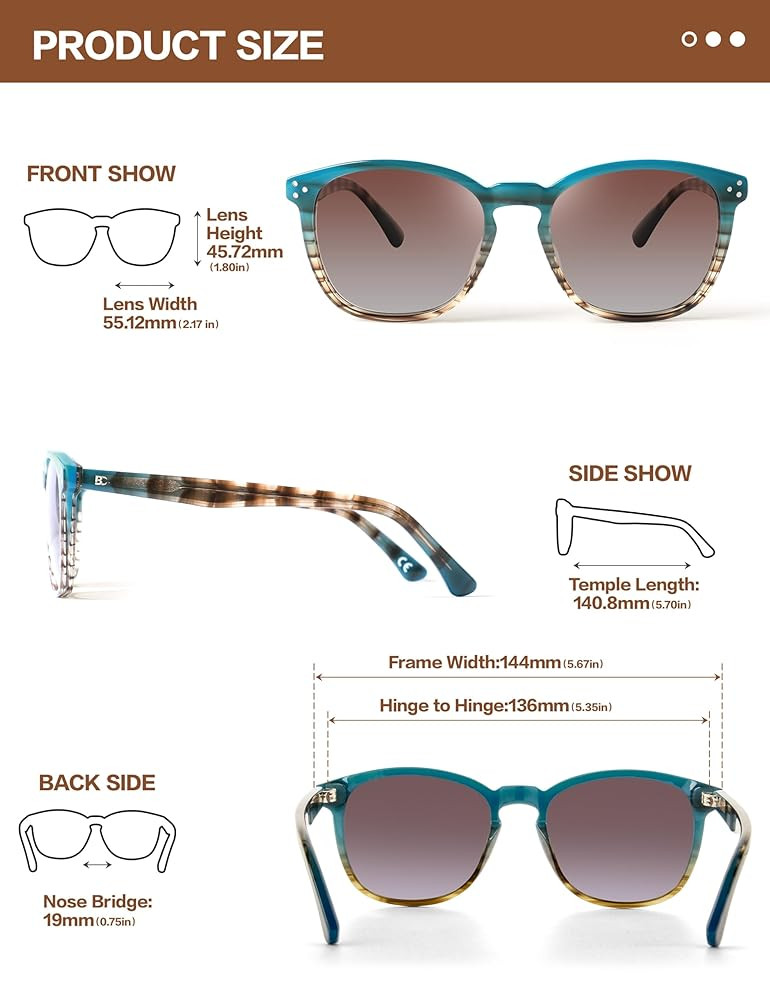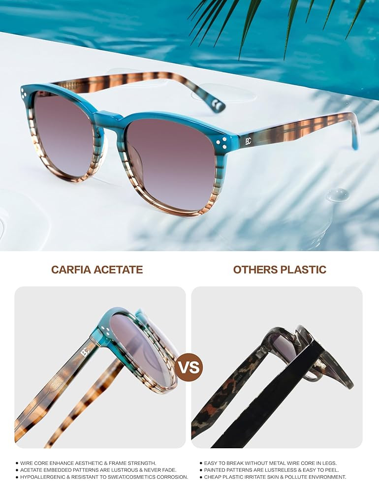 • Acetate frame: Not ordinary plastic frame! Acetate is a high class material which full of shinny and scratch resistant,not easy to leave fingerprint on it and quite easy to manage,so the vintage shades will always looks new even wearing it a long time. this durable lightweight frame with one-piece nose pad will also enable a comfortable and head no-pressure wearing experience.