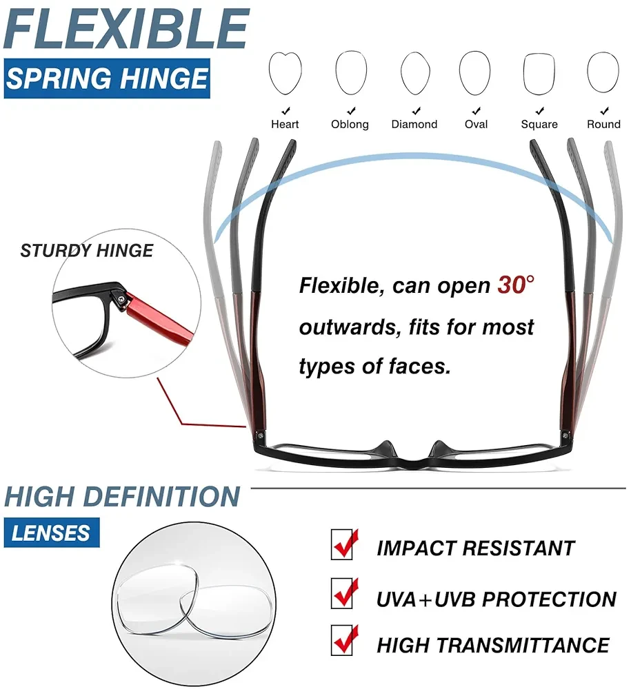 Spring hinges: These reading glasses come with spring hinges. Compared with traditional reading glasses, the frame of the spring hinged glasses can be opened outward by 25 degrees, reducing the pressure on the head when wearing, and perfectly fitting the face shape. The integrated nose pad design makes it difficult for reading glasses to slide off the face