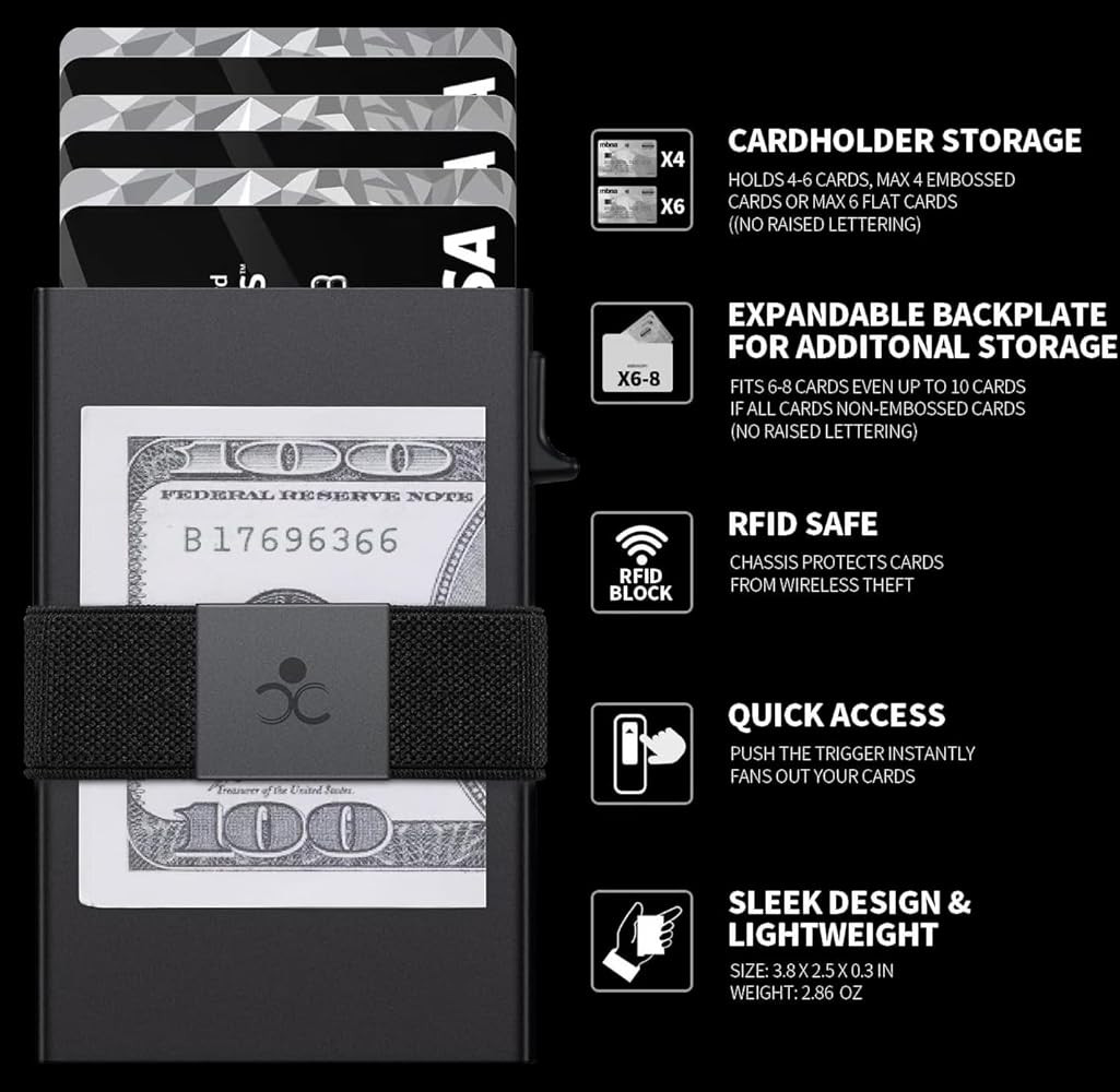 • ? RFID & NFC BLOCKING: This smart wallet use advanced aluminium technology to protect your cards from unauthorized and contactless scanning. Stop thieves from cloning your bank cards and prevent data theft.