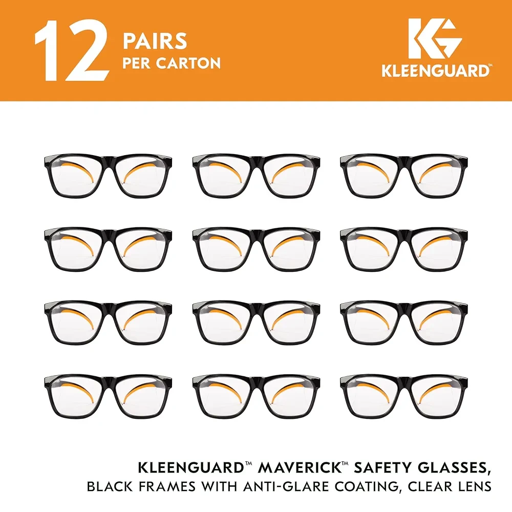 12 Pairs, KleenGuard V30 Maverick Safety Glasses; with Anti-Glare Coating; Clear Lenses; Black Frame; Unisex for Men and Women