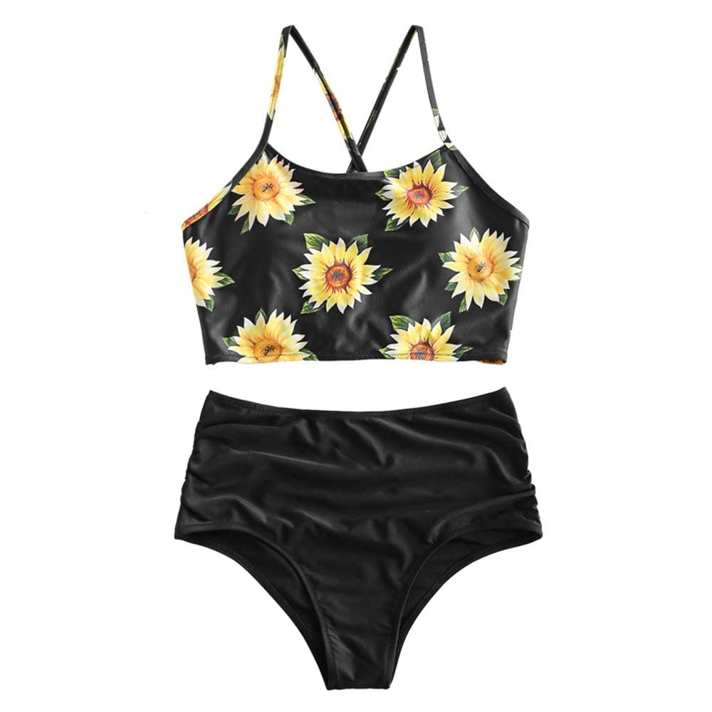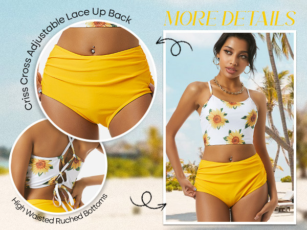 Two piece high coverage tankini set features balmy sunflower print, criss cross lace up straps, padded bra, ruched high rise bottoms hide the belly, our bikini set shows your body shape better