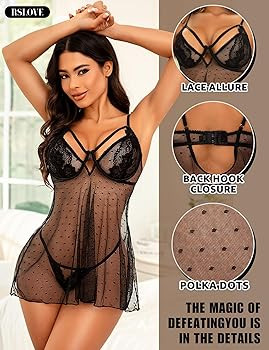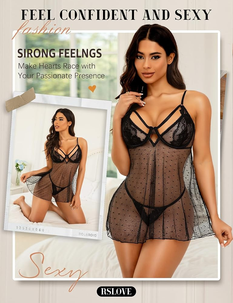 Style: The delicate blend of lace and sheer mesh in this sleepwear exudes both sophistication and allure. Adorned with intricate polka dot patterns and intricate lace detailing, it adds a touch of elegance to your seductive style, paired with adjustable spaghetti straps that ensure a flawless fit