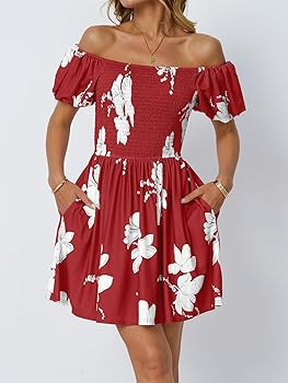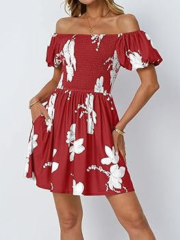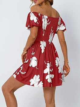 Feature:This women's beach dress is a stunning combination of elegance and comfort. It features an off-the-shoulder neckline that gracefully frames your shoulders, paired with charming short puffy sleeves that add a touch of playfulness.High-waisted, tummy-skimming design accentuates your figure. The beautiful floral pattern adds a vibrant touch, perfect for sunny days and parties.