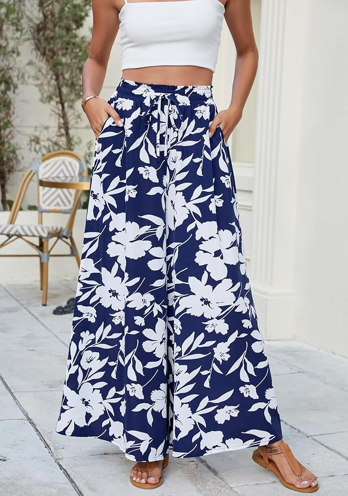 Women's Palazzo Pants Boho Floral Wide Leg Trousers Summer Beach High Waisted Flowy Pants with Pockets