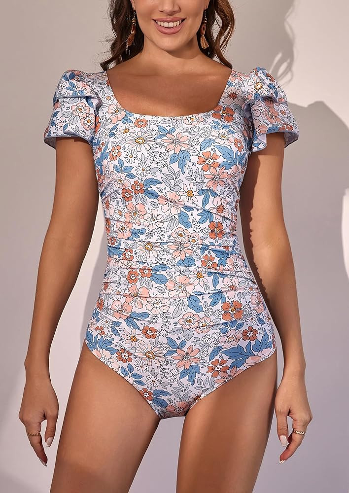 Ruffle One Piece Bathing Suit: The ruffled sleeve of this swimsuit can better cover the arms, making them look slimmer and longer. The square neck and hollow-out back design offers a sexy and vintage look, making you stand out in the crowd