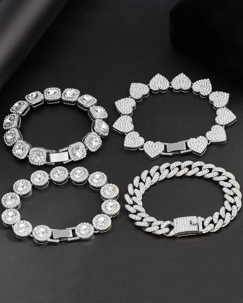 • 4PCS: This women bracelet set includes four different styles of bracelets: a heart bracelet, a square tennis chain, a round tennis chain, and a Cuban chain bracelet. Each bracelet measures 8 inches long. Wear crystal bracelet alone or layer it with other chains for a layered look.