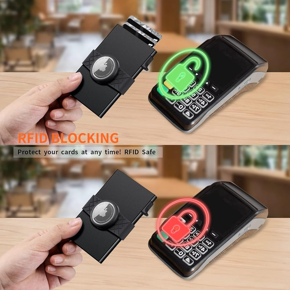 【QUICK POP UP ACCESS & LARGE CAPACITY】 : Simply press the switch on the side of pop-up aluminum case, you can quickly access to your cards. The metal case can hold up to 6 cards (no raised letters), the outside backplate can hold another 6 cards, thus can hold 12 cards in total.