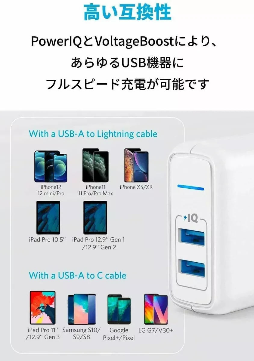 Anker PowerPort 2 Elite USB Quick Charger 24W 2 Ports [PSE Technical Standards /PowerIQ/With Folding Plug/Ideal for Travel】 iPhone/iPad/Galaxy S9/Xperia XZ1, Other Android Support White