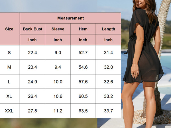 This bikini coverup comes with a deep V neck, chiffon short sleeve, long enough to cover bottom. It provides a good amount of coverage, is the most ideal item for wearing at beach and swimming pool