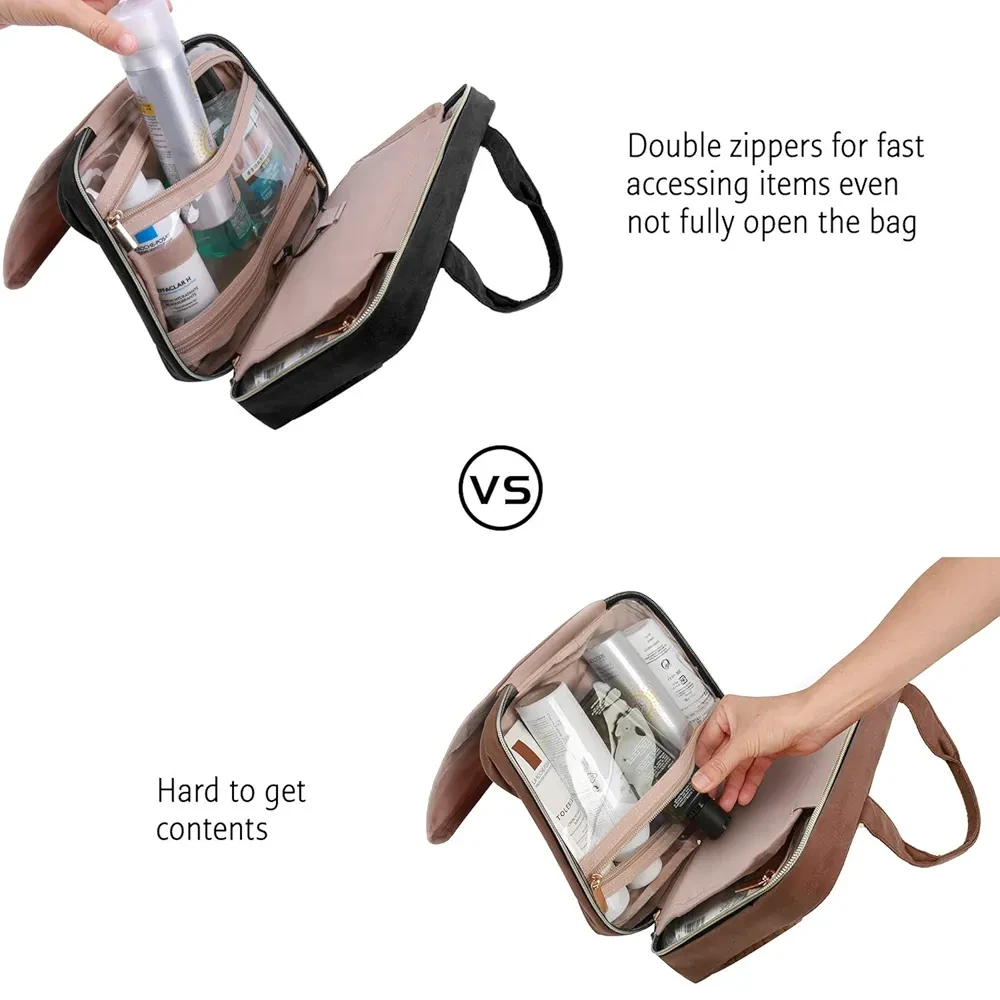 Special Design: Inner main pockets with elastic straps hold bottles upright; double zipper compartment for easy access to the items even not fully open the bag; Transparent sides for providing clear overview of contents