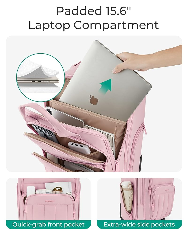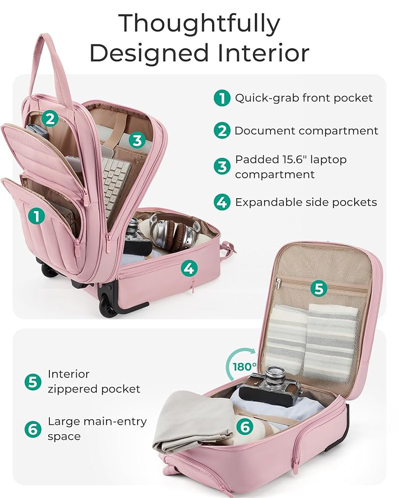 Organized Storage: Effortless organization is achieved with ample storage, internal compartments, and a small zippered pocket for smaller items. The padded laptop compartment fits up to a 15.6-inch laptop. Making it an ideal carry-on for 2-3 day overnight trips.