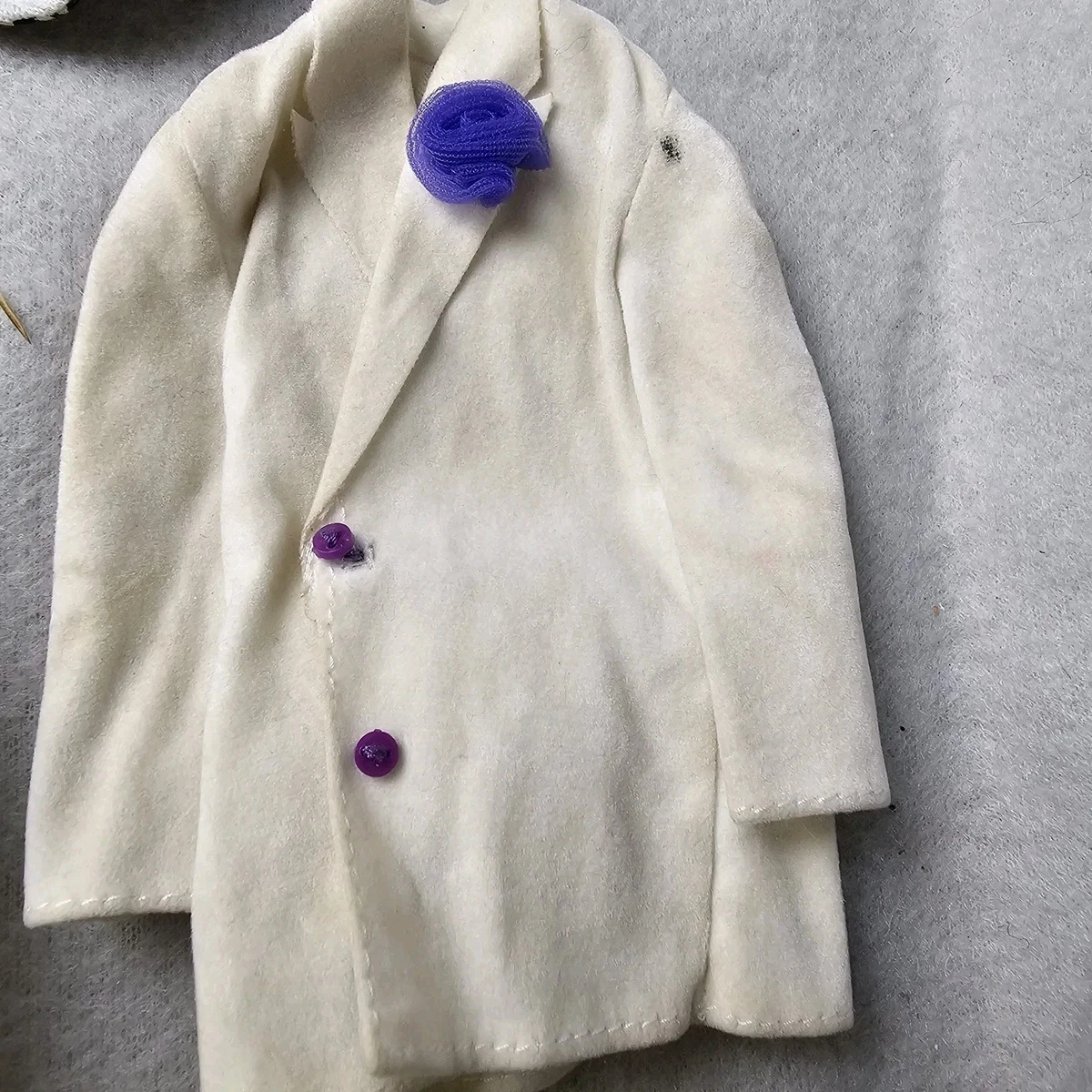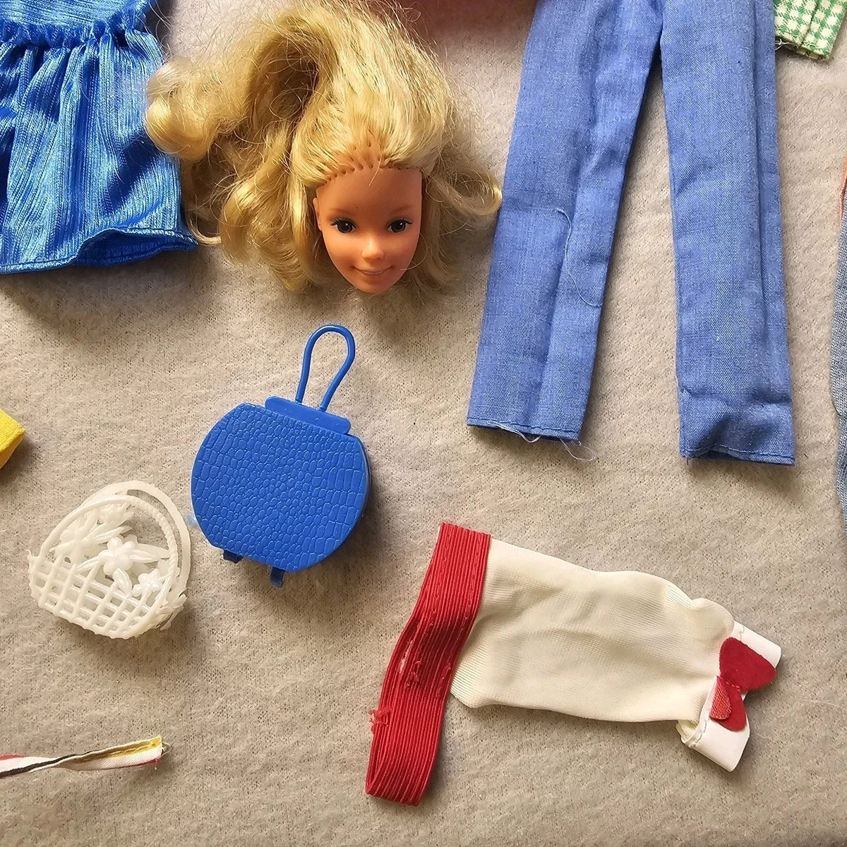 1st 2 pics show everything you will receive, other pics are close ups of everything, barbie head is dated 1976, and the neck ball thing is inside head, some clothing will need stain treatment, mainly the white jacket and some may need small sewing repairs.