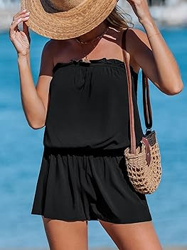 Strapless Swim Cover Up Romper: Strapless beach coverups for women, With a straight neckline, sleeveless design, and an elasticized waist, is the perfect mix of fun and flirty for your beach days