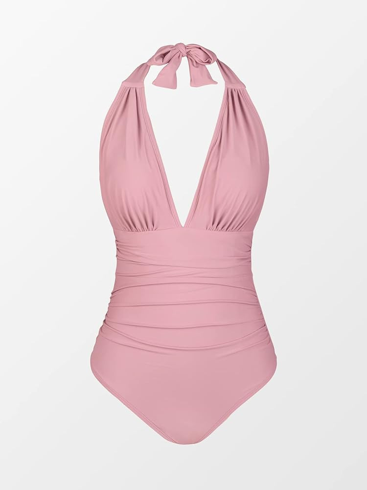 Design: Our Classic Halter Tummy Control One Piece Swimsuit Looks Great on Everybody! This Bathing Suit Features A Deep V-neck, Ruching Details at the Front and Padded Cups for Extra Support
