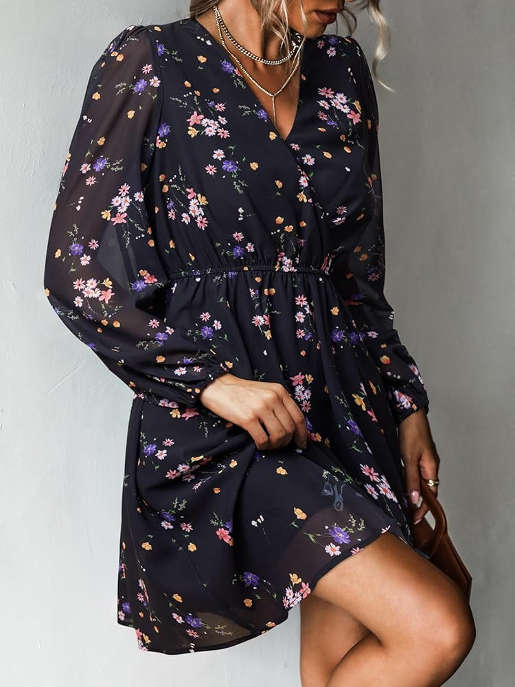 Features: casual dresses for women; v neck dress for women; mini dresses for women; a line dress; elasticized waist dress for women; black dresses women; short dresses for women; floral dress for women; sheer long sleeve dress; summer dresses for women; chiffon dress
