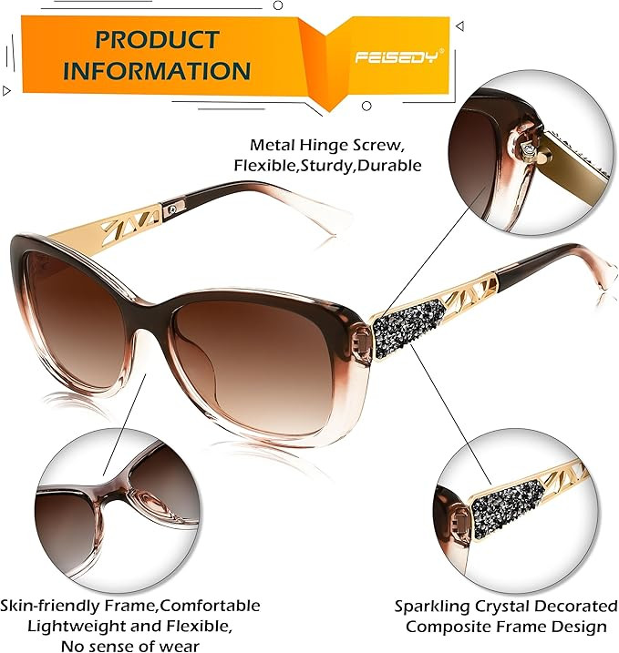 • 【High Quality Materials】Sunglasses for women is make of high strength polyester composite material makes glasses more wear-resistant and sturdy and comfortable to wear.Women sunglasses suitable for most facial shapes.