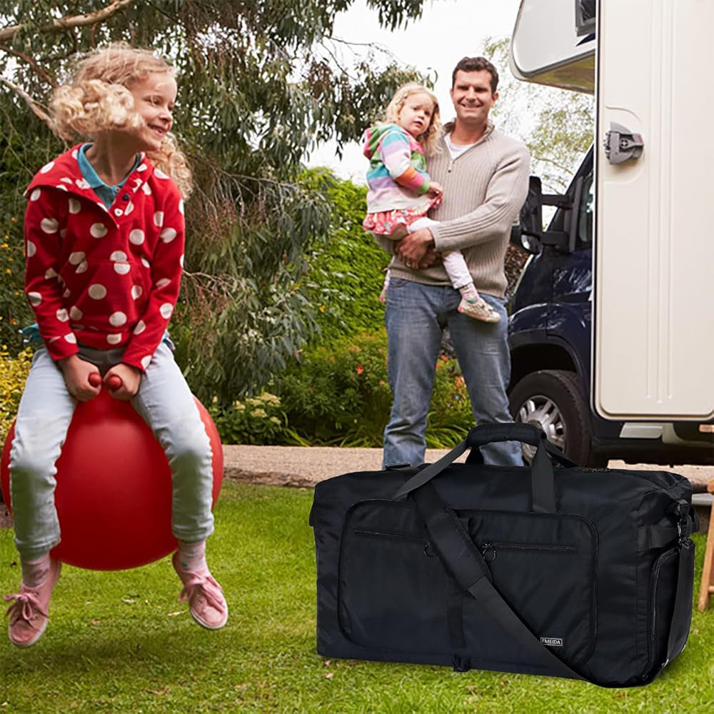 Large Capacity & Foldable: This foldable duffel bag has a large capacity of 65L and can be fast folded into a really small size. Unfolded size: 24.5 x 11.5 x 14 in, Folded size: 10.24 x 9.06 in. It can be used as a "Just in Case" bag to avoid extra baggage charges