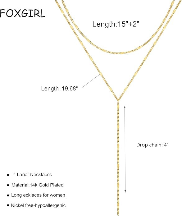 Foxgirl Lariat Gold Necklace for Women, Dainty Long Necklace 14k Gold Plated/Silver Y-Shaped Pendant Necklace Trendy Layered Cz Beaded Chain Drop Necklaces Simple Gold Jewelry For Women Gift