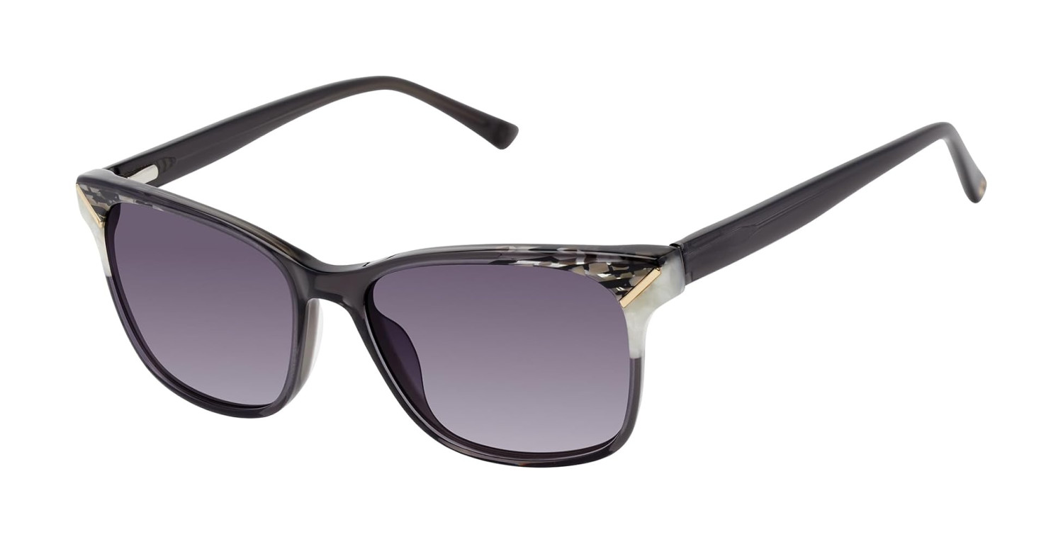 • Sleek shades of grey are uniquely accented with a gold metal inlay over patterned and pearlized pops of black, crystal, and bone Frame measurements: 55 mm lens width | 16 mm bridge | 140 mm temple length