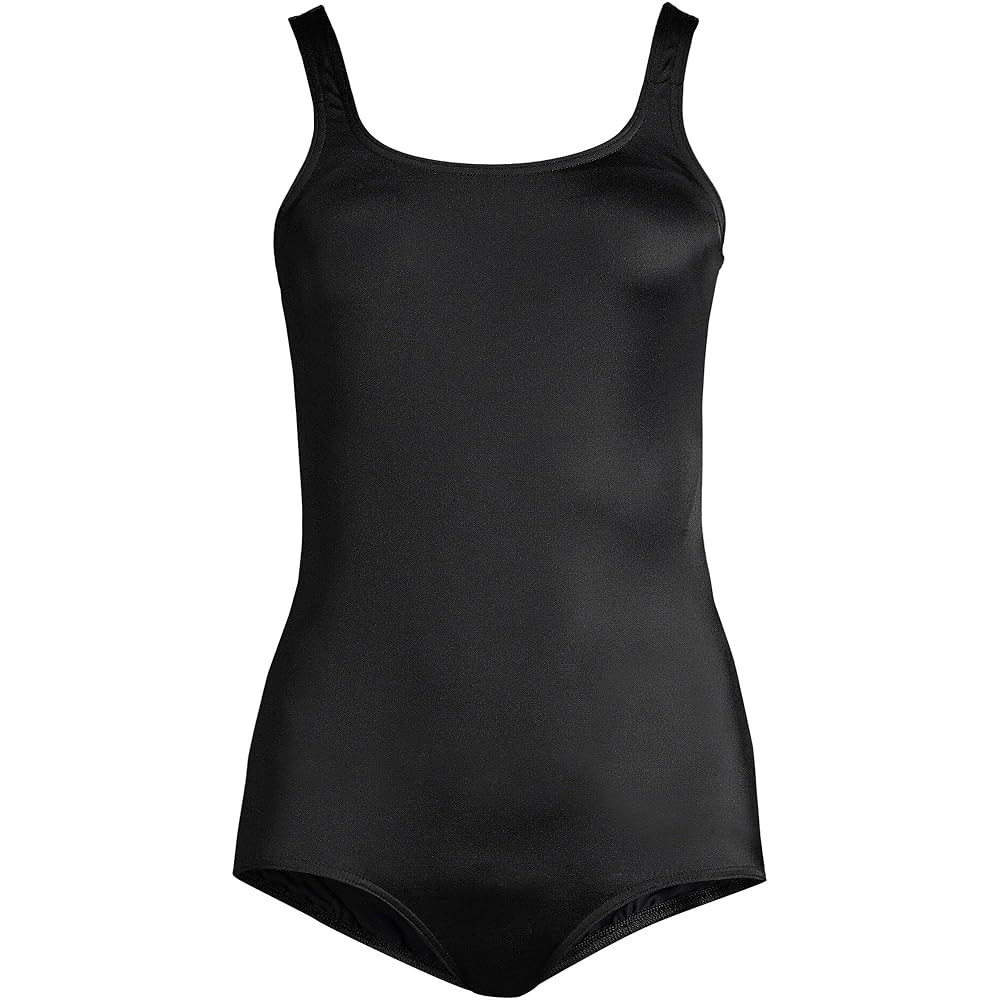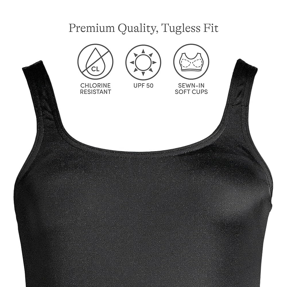 Athletic Support: Built-in soft cup bra adds comfort and support without underwire. Wide shoulder straps stay in place. High scoop neck in front and back. Tugless one piece provides a fuss free fit.