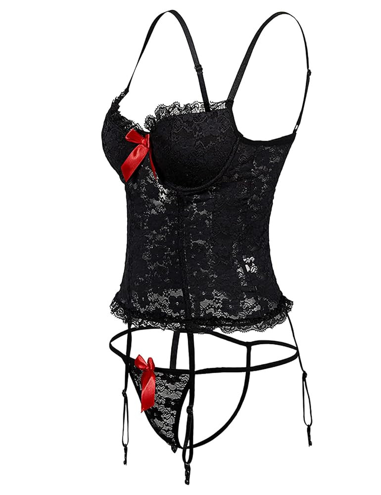【SEXY STYLE】:See through lace bodysuit with comfortable push up bra, soft pads, wireless underwear, delicate satin bow knot deco, adjustable spaghetti straps, stretch suspender matching intimate G-string bottom.