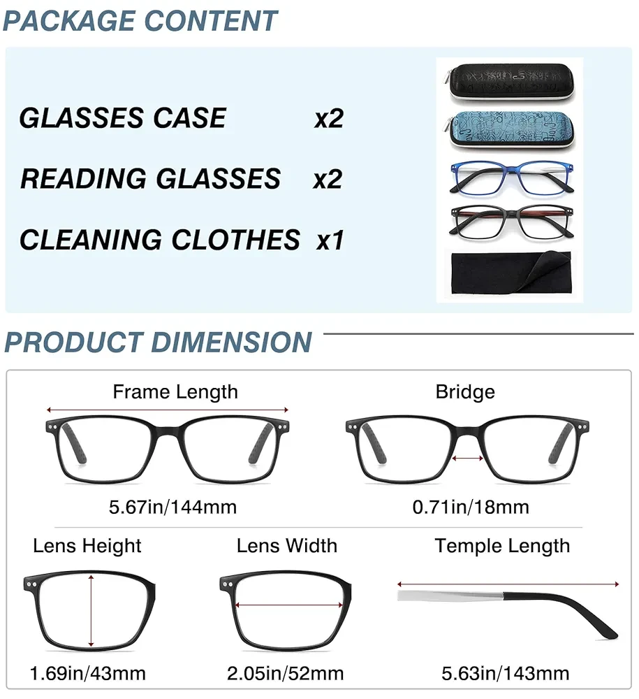 Spring hinges: These reading glasses come with spring hinges. Compared with traditional reading glasses, the frame of the spring hinged glasses can be opened outward by 25 degrees, reducing the pressure on the head when wearing, and perfectly fitting the face shape. The integrated nose pad design makes it difficult for reading glasses to slide off the face