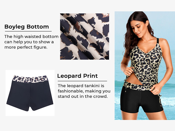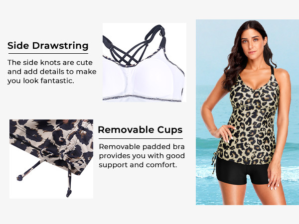The V neck ruched front with functional drawstring tie side tankini top and boy short for women, which is modest yet still flirty and charming.