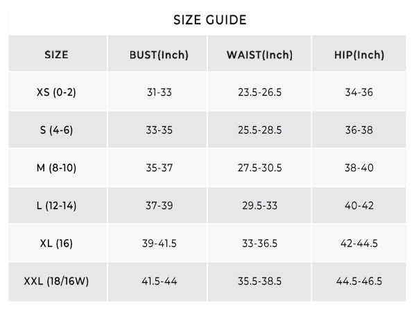 Available in a variety of sizes: XS(US 0-2), S(US 4-6), M(US 8-10), L(US 12-14), XL(US 16), XXL(US 18). Please choose the suitable size according to the Size Chart before purchasing.